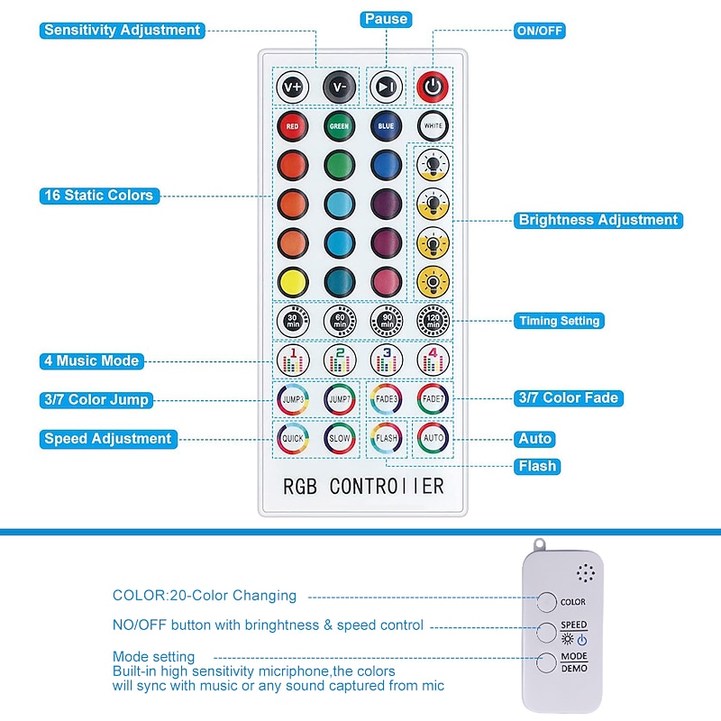 RGB LED Strip Light 20M 65ft Waterproof Music Sync 12V 5050 SMD Color Changing Bluetooth Controller 100-240V Adapter for Bedroom Home TV Back Light DIY Deco 14