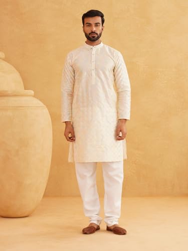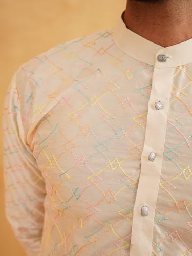 HOT ! Sojanya (Since 1958 Men'S Silk Blend Cream Kurta With Multi Color Embroidery