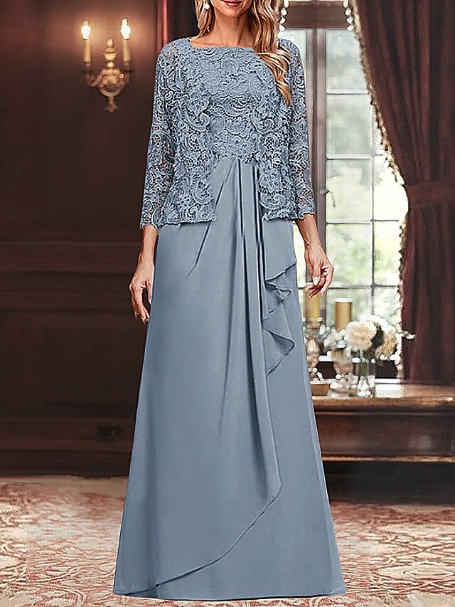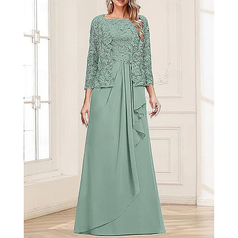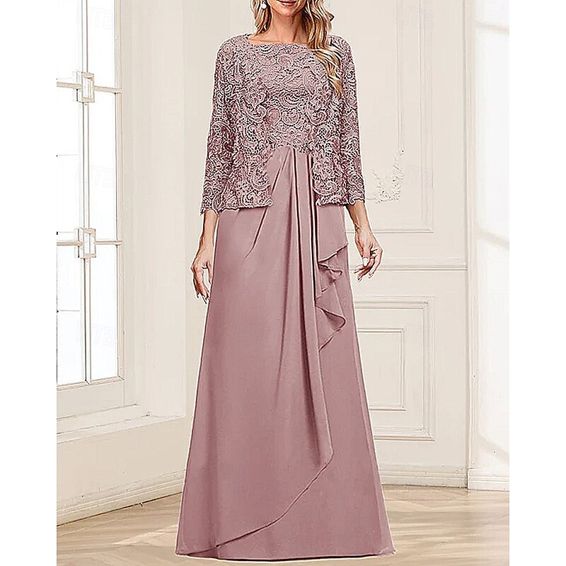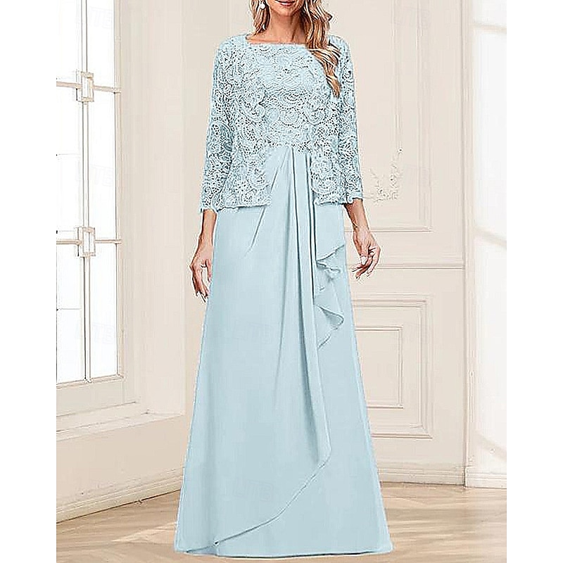 More information about Two Piece A-Line Mother of the Bride Dress Elegant Simple Minimalist Square Neck Floor Length Chiffon Corded Lace Sleeveless 3/4 Length Sleeve with Pleats Ruched Cascading Ruffles
