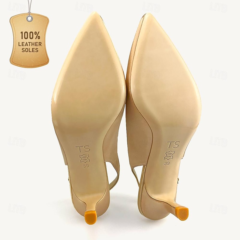 The shoes are embellished with dazzling crystals along the edges, adding a touch of glamour to their sleek design. The slingback style not only enhances elegance but also provides stability and support, making these shoes an ideal choice for weddings, parties, and special events.