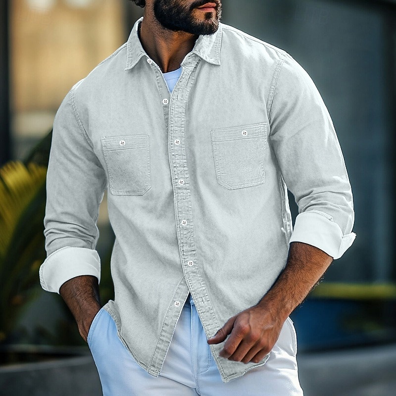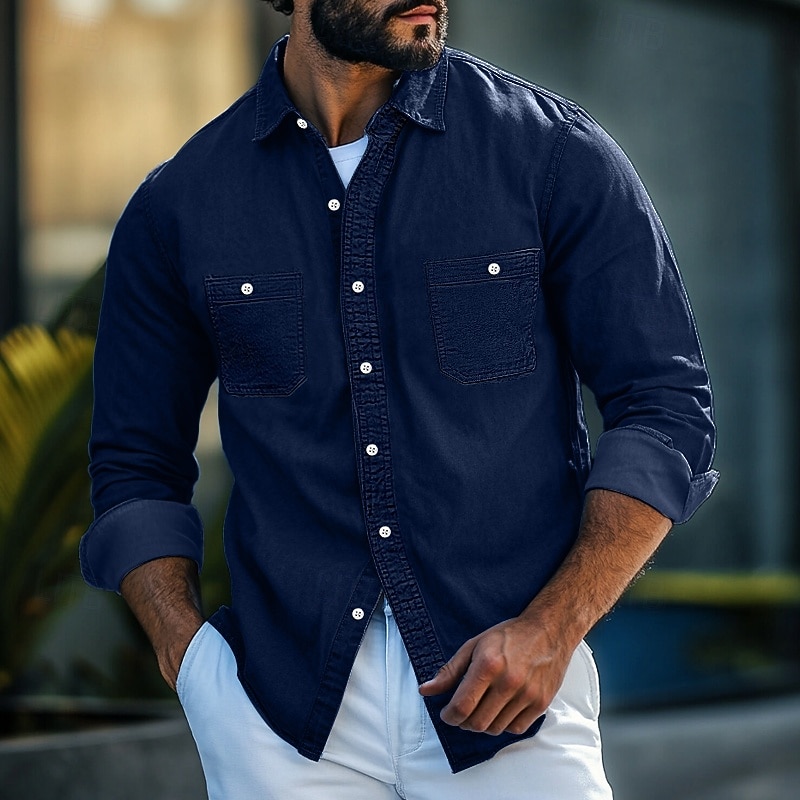More information about Men's Shirt Chambray Shirt Button Up Shirt Casual Shirt Denim Blue Black Navy Blue Light Blue Long Sleeve Plain Collar Daily Vacation Clothing Apparel Fashion Casual