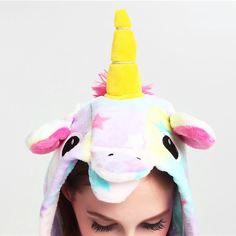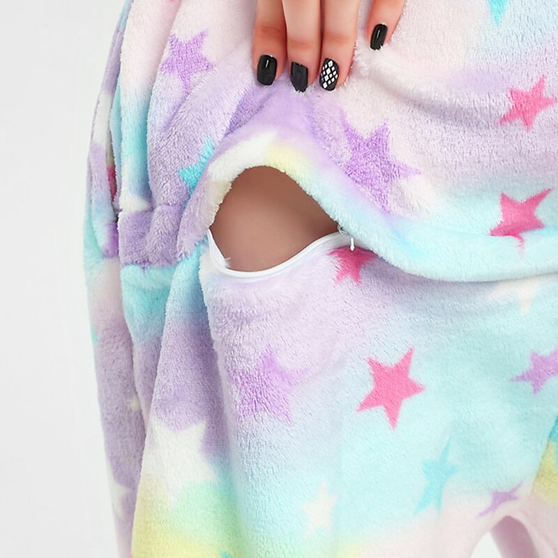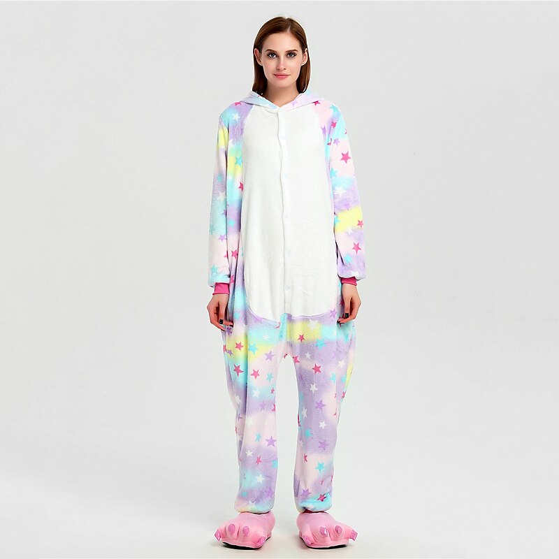 Highlights [Fabric] : Crafted from soft and cozy flannel fabric, these unicorn-themed onesies provide warmth and comfort, making them ideal for lounging or sleeping. The inelastic material ensures a relaxed fit that retains its shape. [Fit] : Designed for both men and women, these onesies offer a comfortable, unrestrictive fit. The elasticized cuffs and ankles ensure that warmth is trapped inside, providing a cozy, snug experience. [Design Highlights] : Featuring a whimsical pastel color palette with embroidered star patterns, these onesies bring a touch of magic to your nightwear. The hood is adorned with playful unicorn horns and ears, enhancing the enchanting unicorn theme. Front button fastening allows for easy wear, while the foot area mimics hooves for a complete look. [Occasions] : Perfect for Christmas parties, carnival celebrations, Children's Day, and the New Year, these onesies are versatile for various festive events. They add a fun, cute touch to any holiday celebration or casual lounging day. [Size Range] : Available in sizes S to XL, providing options to fit a wide range of body types comfortably.