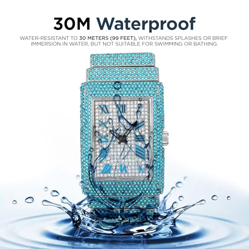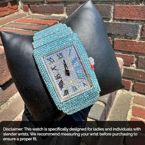 • Dial Size 43MM x 34MM – Distinctive unisex design with a bold rectangular shape, fully iced-out with handset blue CZ crystals.