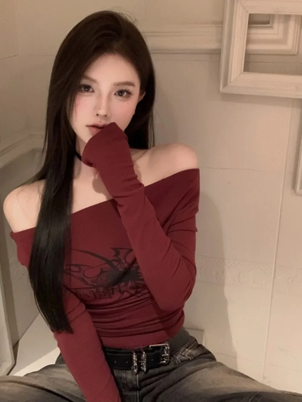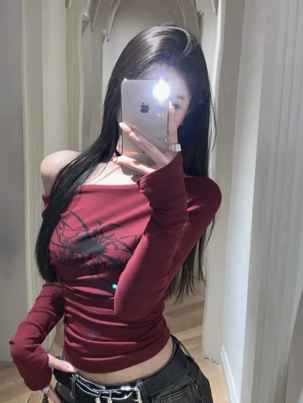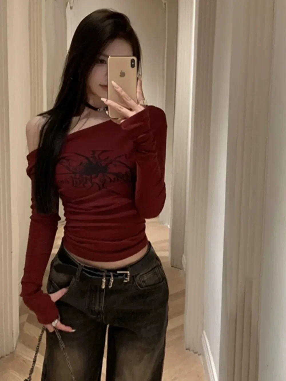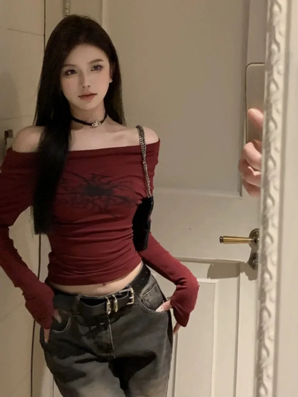Gothic Spider Graphic Grunge T Shirts Women Y2k Off Shoulder Vintage Crop Top Korean Style Kpop Coquette Long Sleeve Tees 2025