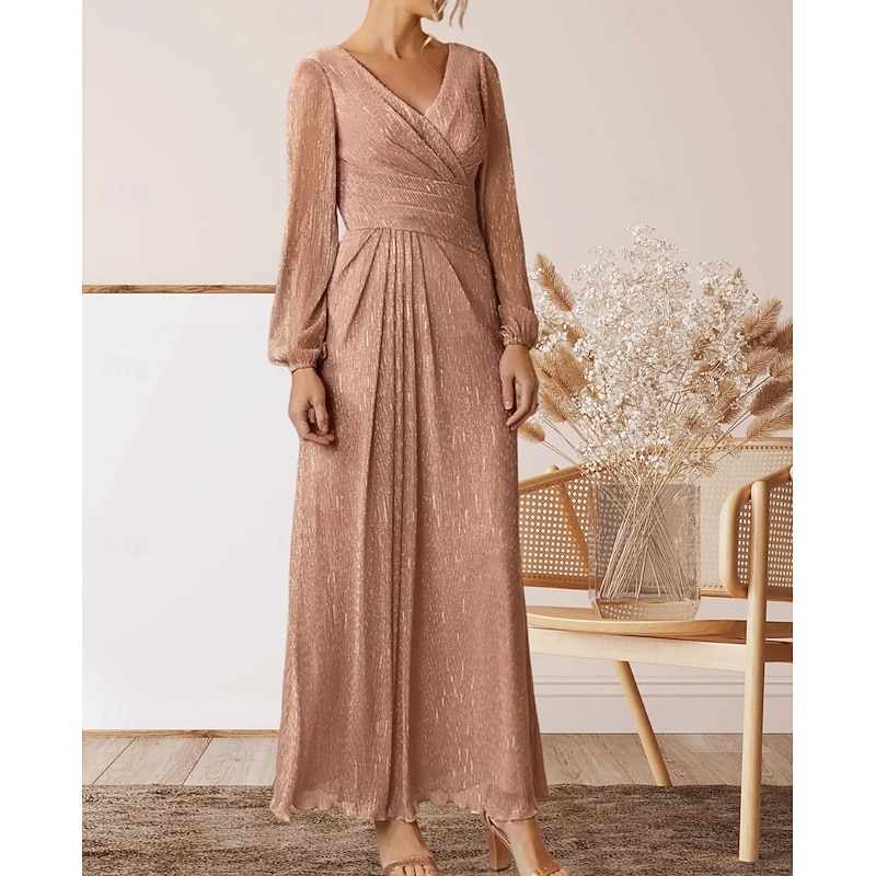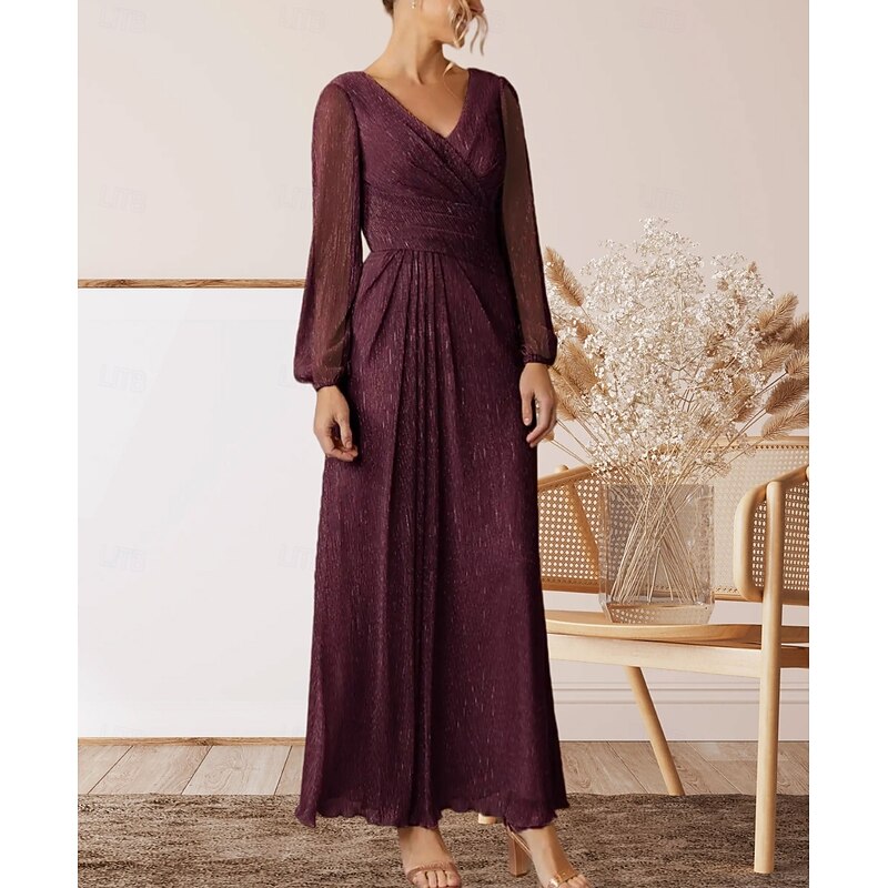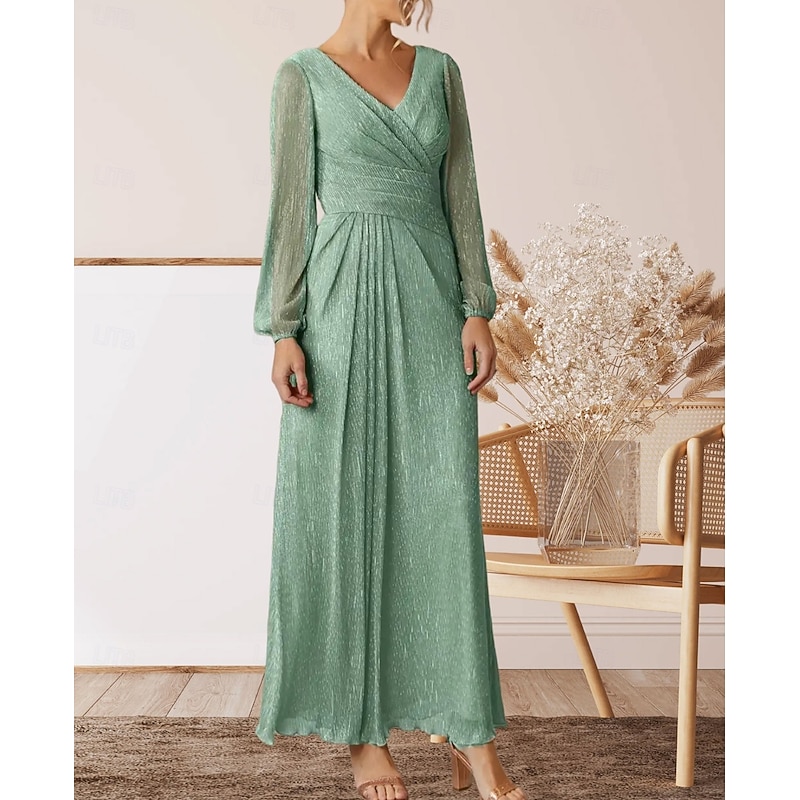More information about A-Line Mother of the Bride Dress Wedding Guest Elegant V Neck Floor Length Chiffon Long Sleeve with Pleats Ruching