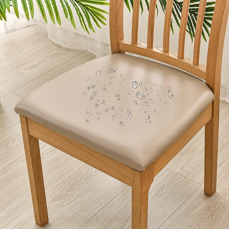 Highlights 1. SLIGHT COLOR NOTE: Please note that slight color difference should be acceptable due to the light and screen. 2. WATERPROOF: The product is made of PU leather, 100% waterproof. 3. PERFECT SIZE: Stretch chair seat cover fit for normal dining chair. Please measure your chair before choosing. Chair seat width 36cm - 48cm(14in-19in); Chair seat length 36cm - 48cm(14in-19in); The thickness of chair seat 2.5cm - 6cm (1in-2.5in); 3. PERFECT PROTECT: Chair seat covers safeguard your dining chairs from stains, dirt and pet damages as they update furniture to fit your evolving style. Our chair slipcover is perfect for homes with kids, dogs and cats, allowing it to perfectly combine style and durability, add new life to your chairs. 4. EASY CARE: Machine washable, wash at temperature under 30 ℃ ( 86.00 ℉). Please do not bleach, do not iron