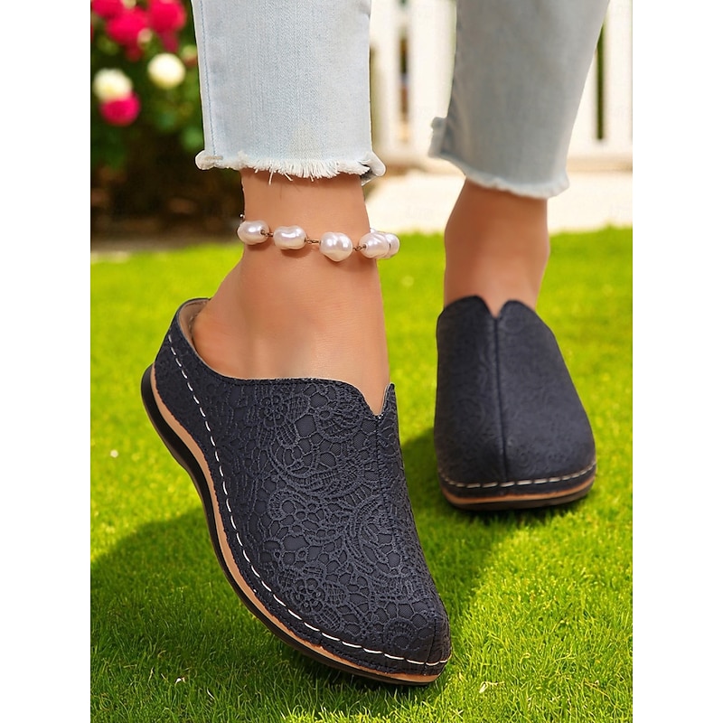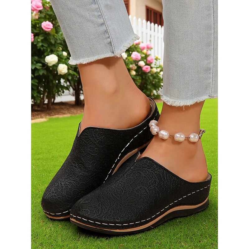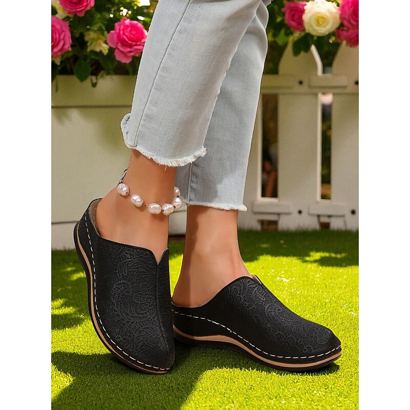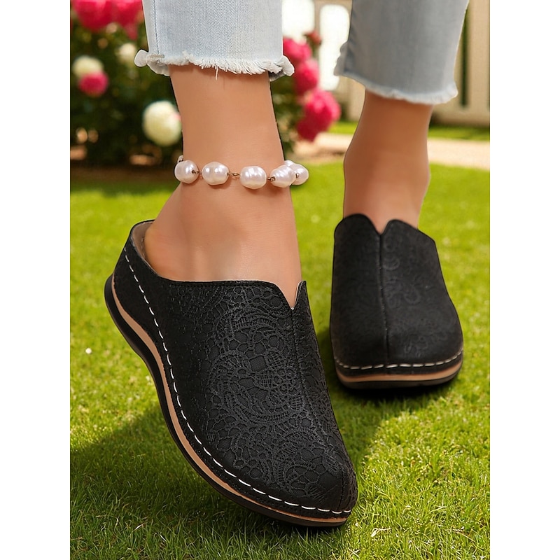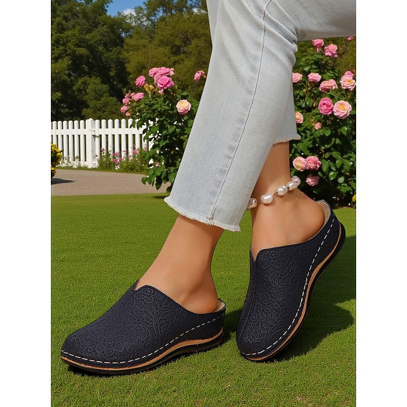 HOT ! Women's Faux Leather Slip-On Mules – Breathable Lace-Patterned Comfort Clogs for Gardening, Housewear and Casual Outfits