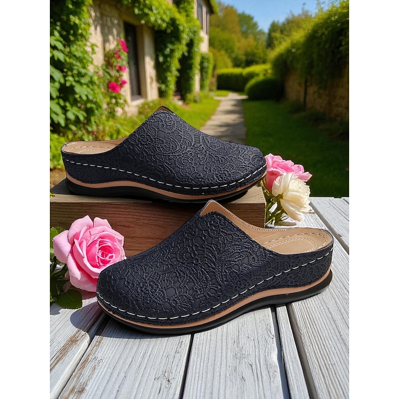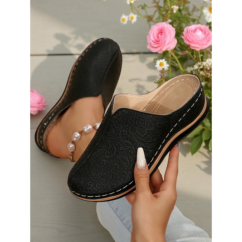 Women's Faux Leather Slip-On Mules – Breathable Lace-Patterned Comfort Clogs for Gardening, Housewear and Casual Outfits 24