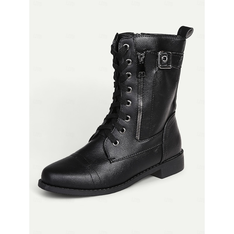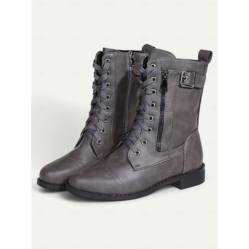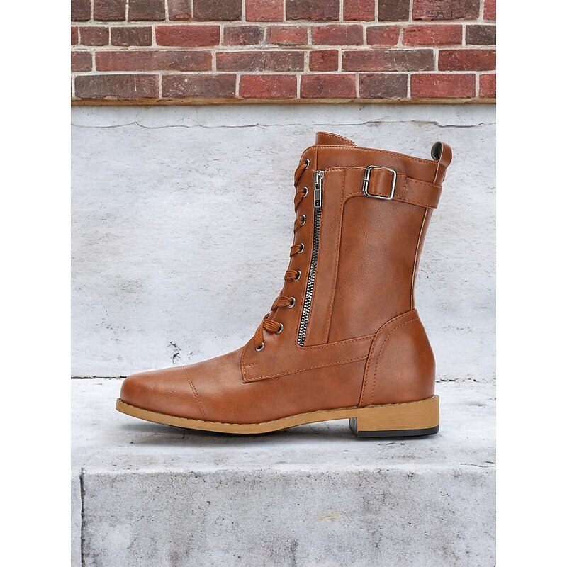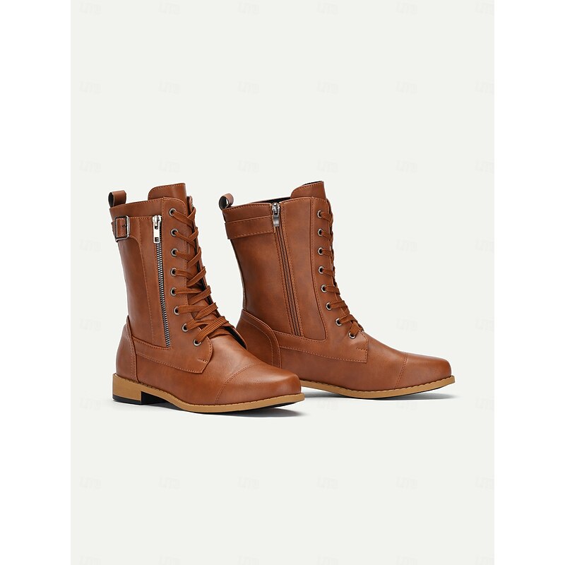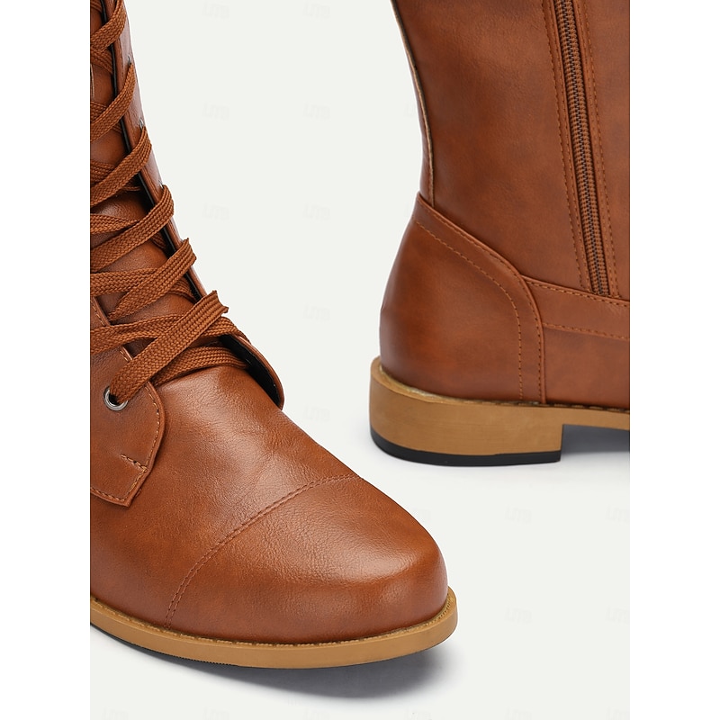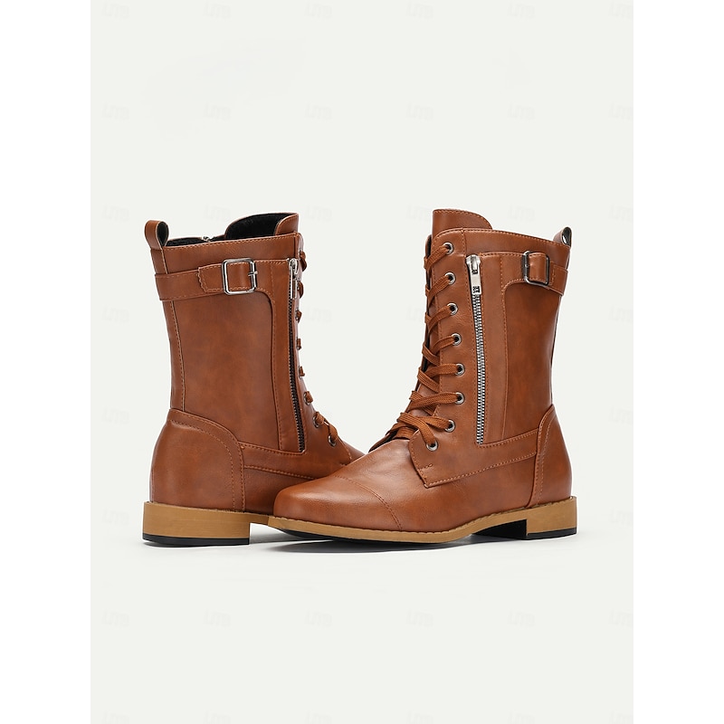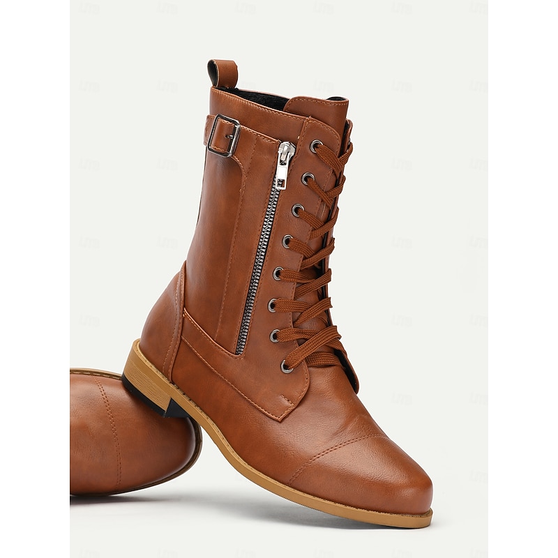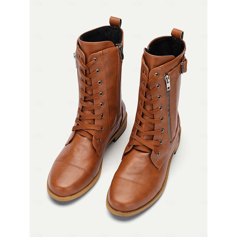 Highlights [Fabric] : Crafted from high-quality faux leather, these women's ankle boots are designed to offer both style and durability. The boots feature a lace-up front, complemented by a side zipper closure for easy on-and-off access. [Fit] : These ankle boots showcase a vintage-inspired silhouette with a slightly rounded toe and a chunky heel, providing a balance of comfort and support. The design ensures a secure fit for all-day wear, perfect for both casual and outdoor activities. [Design Highlights] : Combining classic elements with modern touches, these boots feature a lace-up design paired with a convenient zipper closure. The rich brown color and faux leather construction give them a timeless, versatile appeal, suitable for a variety of looks. [Occasions] : Ideal for daily wear and outdoor adventures, these boots are perfect for fall and winter seasons. They can effortlessly complement an array of outfits, making them suitable for casual outings or a touch of elegance during semi-formal events. [Size Notice] : Available in a range of sizes, these boots cater to various foot sizes, from US5.5 to US10.5, ensuring a perfect fit for everyone. Designed as standard size, it's recommended to select your usual size for optimal comfort.
