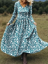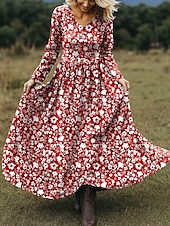 Women's Maxi Dress A Line Dress Vacation Casual Boho Beach Regular Fit Floral Graphic Long Sleeve V Neck Red Blue Purple Green Spring Fall