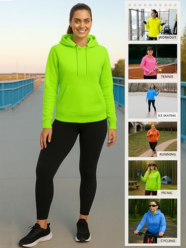 • Winter Protection: This neon womens hoodie can be worn alone or layered for extra warmth during winter activities. Featuring an adjustable hood with strings for a comfortable fit and long sleeves to keep you warm, it’s perfect for cold days. The kangaroo-style pockets add style, making it ideal for fall, winter, and spring.