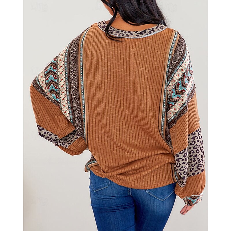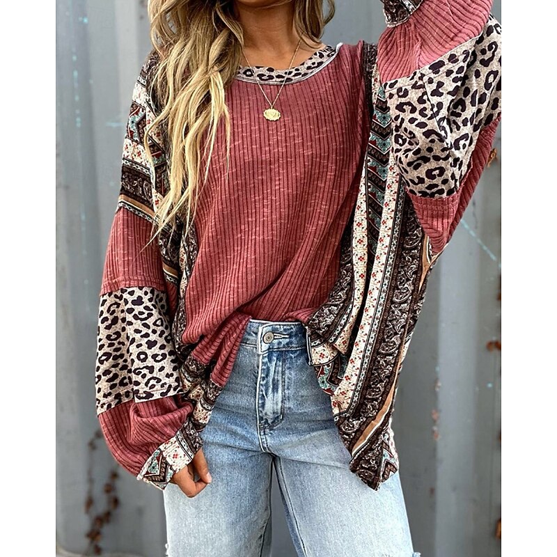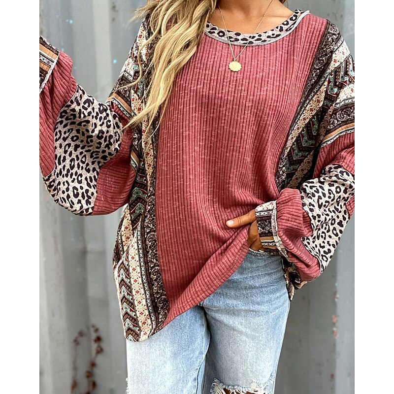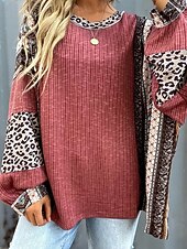 More information about Women's Texture Sweatshirt Pullover Sweatshirt Sweatshirts Leopard Color Block Streetwear Casual Long Sleeve Crew Neck Regular Tops Street Holiday Going out Patchwork Wine Brown Fall Winter
