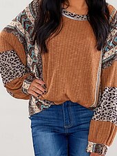 Highlights - Stay warm and stylish this winter with our polyester women's sweater. - Features a trendy leopard and color block pattern with patchwork design. - Loose fit for ultimate comfort and chic look. - Complete your look with a crew neck neckline. - Perfect for adding a pop of fashion to your winter wardrobe.