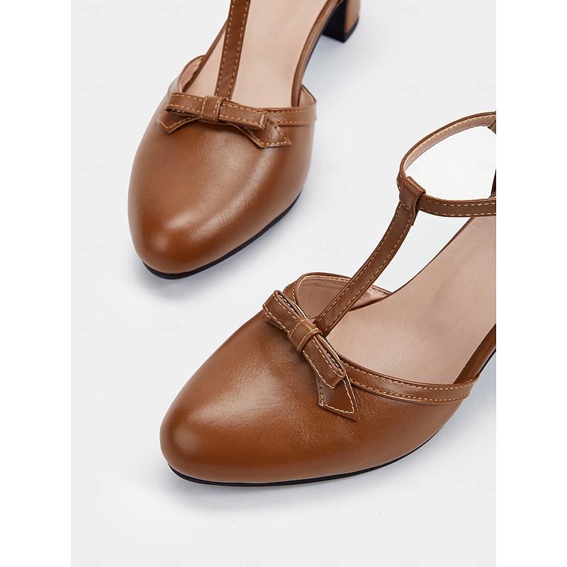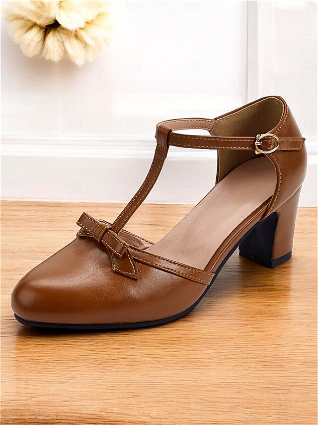 Women's Brown T-Strap Mary Jane Shoes with Bow, Mid-Heel Vintage Design, Perfect for Everyday Wear and Office 1