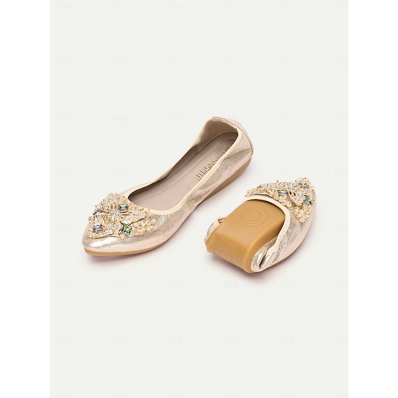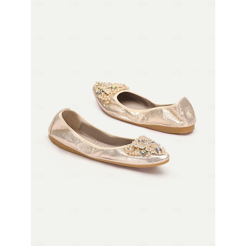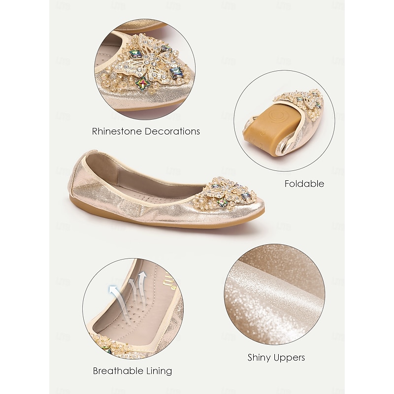 Highlights [Fabric] : Crafted from high-quality faux leather, these women's flats feature a shimmering gold fabric base that radiates elegance. The intricate crystal embellishments on the upper add a touch of sparkle and sophistication, making them a standout piece in any wardrobe. [Design] : The classic foldable ballet design allows for easy storage and portability. The flat heel and loafer-style closure ensure comfort and ease, while the floral pattern adds a charming, casual touch. The cushioned insole promises long-lasting comfort, and the TPR outsole offers superior flexibility and durability. [Design Highlights] : The dazzling crystal embellishments form an intricate pattern on the toe, adding a luxurious and ornate detail that enhances the overall design. Perfect for complementing a variety of outfits, these flats effortlessly elevate any look with their chic and stylish appeal. [Occasions] : Ideal for a wide range of occasions, from daily wear and beach outings to weddings and vacations. Whether it’s a casual day out or a special celebration, these versatile flats bring a touch of glamour to any setting. [Size Range] : Available in sizes ranging from US5.5 to US11.5, these flats are designed to accommodate a variety of foot sizes, ensuring a comfortable and perfect fit for every wearer.