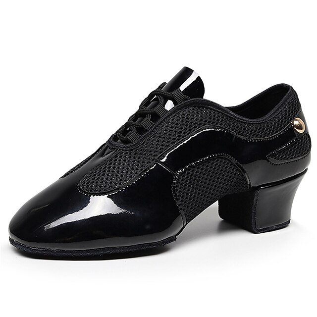 HOT ! Women's Black Patent Leather Latin Dance Shoes – Breathable Mesh Lace-Up Ballroom Performance Shoes with Suede Sole for Salsa and Tango