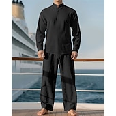 Men's Linen Shirt T-shirt Suits Shirt and Pant Sets 2 Pieces Outfits Long Sleeve Stand Collar Spring Fall Plain Fashion Casual 2 Piece Vacation Daily Wear Going out Black+ Khaki Black Navy Blue Top 10