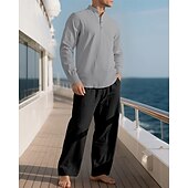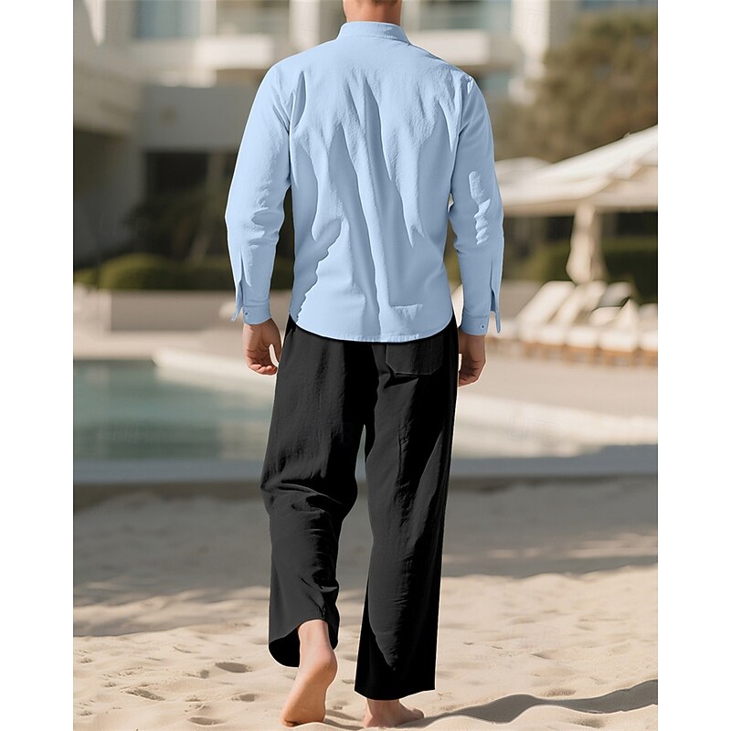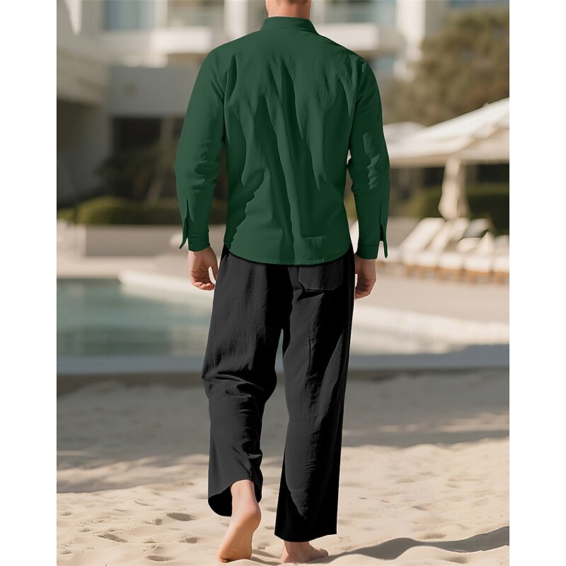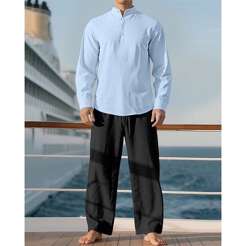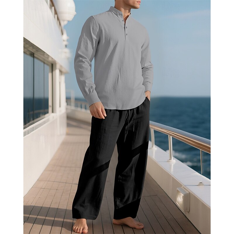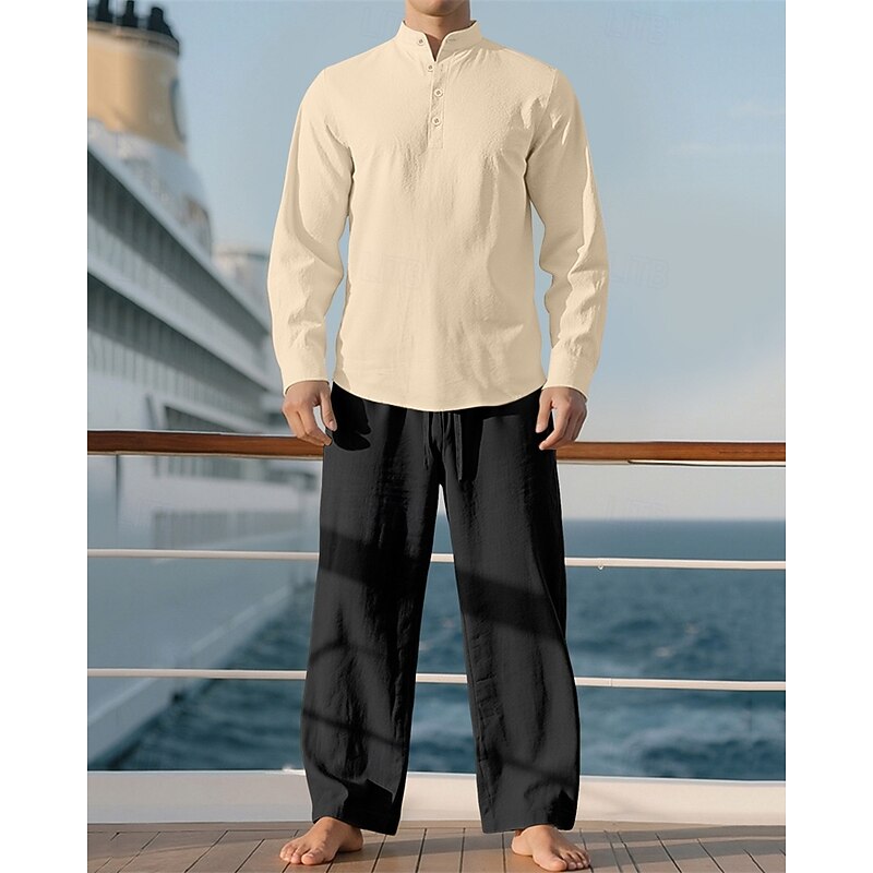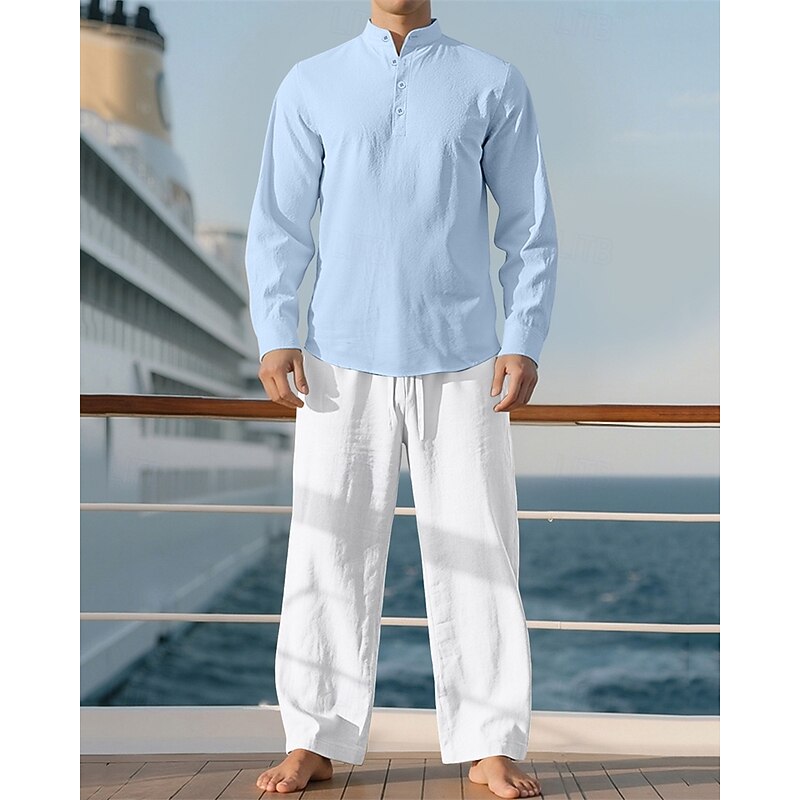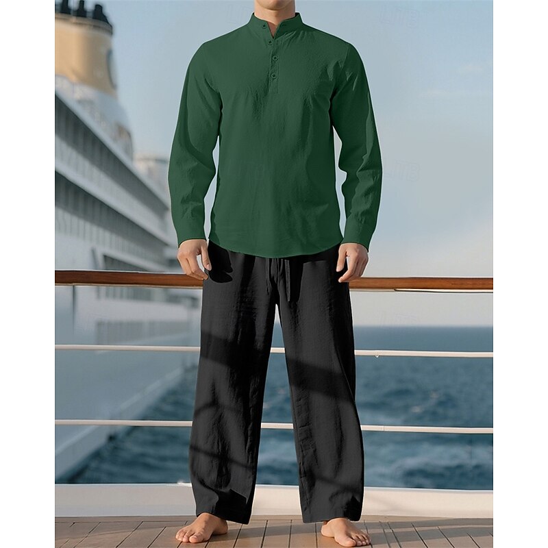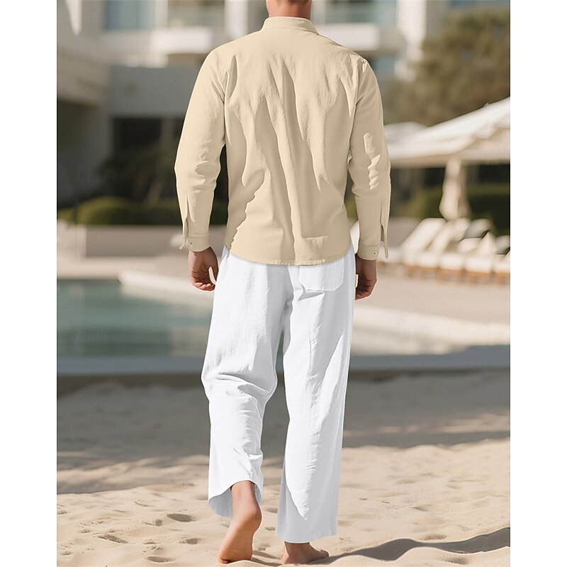 Highlights - Perfect for Spring and Fall seasons - Features long sleeves for added warmth - Designed for men in a casual style - Includes a linen shirt and 2 pieces outfits - Ideal for a vacation outfit - Stand collar adds a stylish touch
