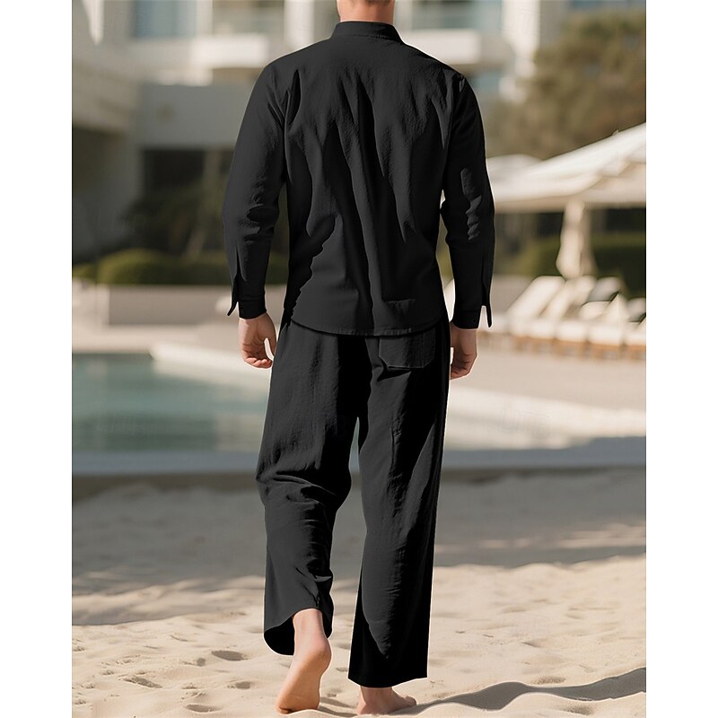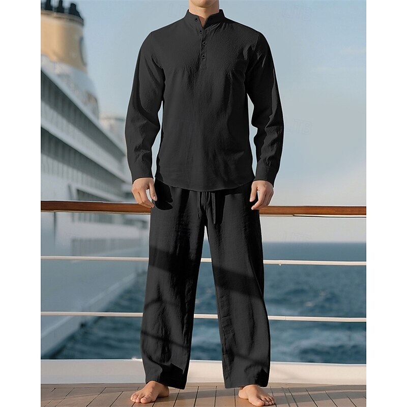 HOT ! Men's Linen Shirt T-shirt Suits Shirt and Pant Sets 2 Pieces Outfits Long Sleeve Stand Collar Spring Fall Plain Fashion Casual 2 Piece Vacation Daily Wear Going out Black+ Khaki Black Navy Blue Top