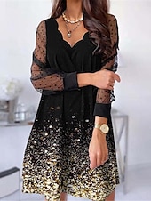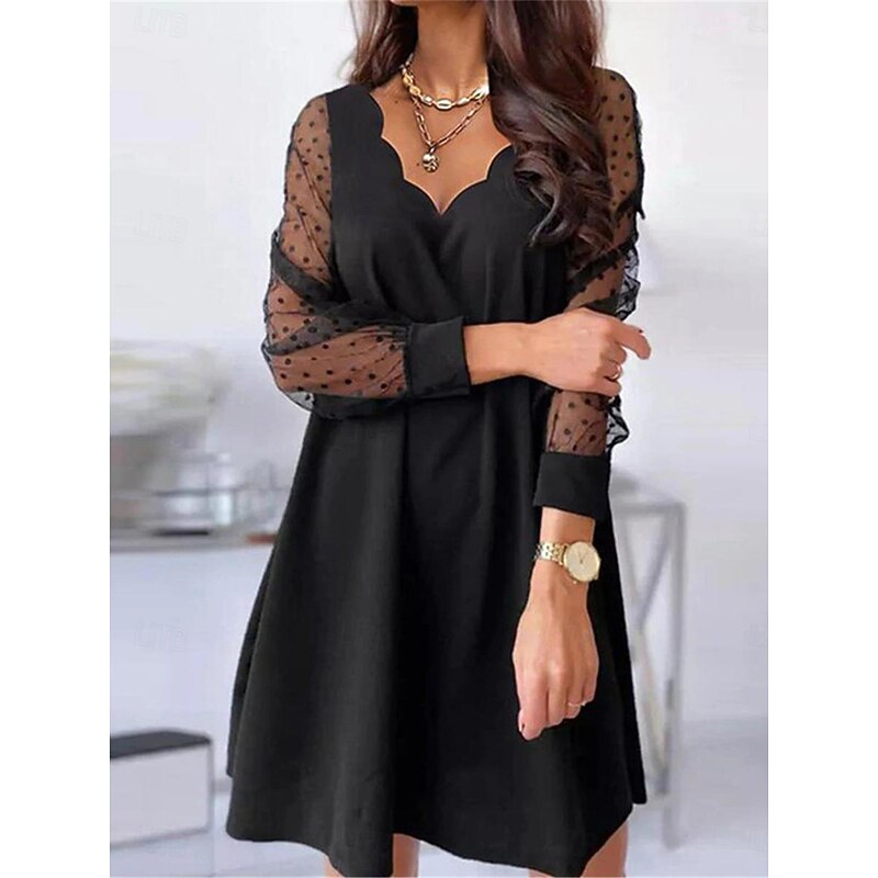Highlights [Fabric]: Crafted from premium polyester, this dress offers a lightweight and breathable wear, perfect for keeping cool during warm summer days. The fabric's micro-elasticity ensures a comfortable fit while maintaining its structure. [Silhouette]: Featuring a chic A-line silhouette, the dress provides a flattering fit suitable for both casual and semi-formal occasions. The regular fit design enhances its versatility, making it a staple piece for any wardrobe. [Design Highlights]: The dress showcases a unique scalloped neckline, adding an elegant touch to the overall design. The upper part is adorned with sheer, polka-dotted mesh sleeves, infusing sophistication and charm. The floral mesh patchwork seamlessly transitions from a solid black background to the vibrant pink floral bottom, creating a captivating visual effect. [Occasions]: Ideal for vacations, street outings, and holiday events, this versatile dress can be effortlessly styled for various occasions. Whether paired with heels for a chic look or flats for casual wear, it adapts to a range of settings with ease. [Size Range]: Available in a wide range of sizes from S to 5XL, this dress caters to diverse body types, ensuring a perfect fit for everyone.