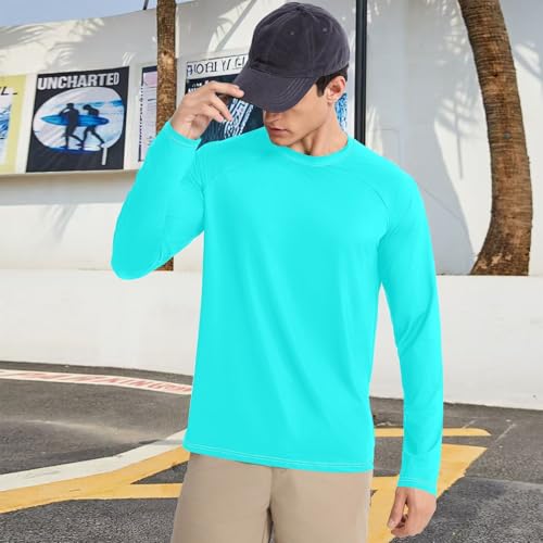HOT ! Cyan Blue Men's Swim Shirts UPF 50+ Loose Crew Neck Round Neck Mens Sun Protection Long Sleeve Summer