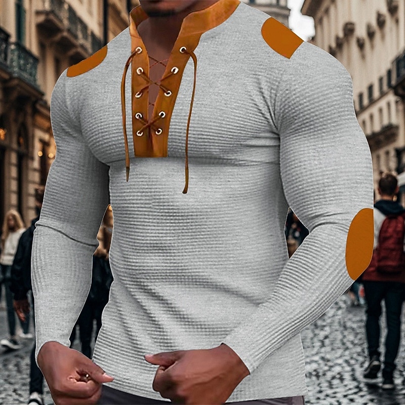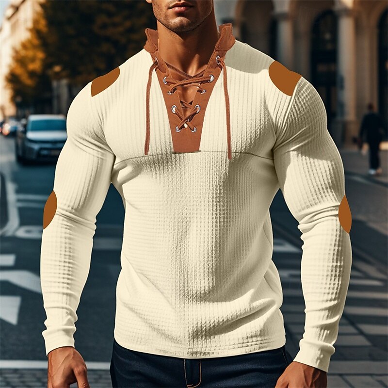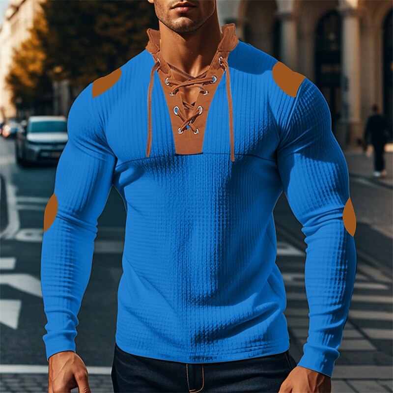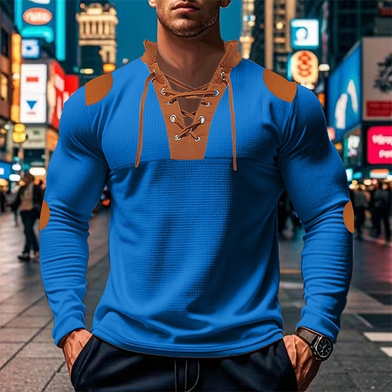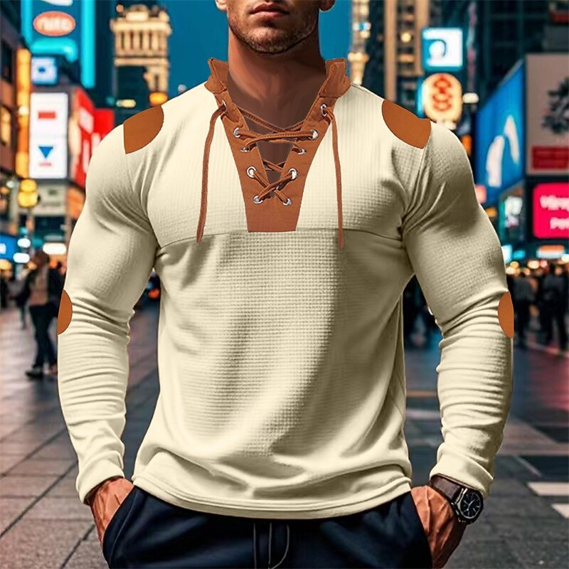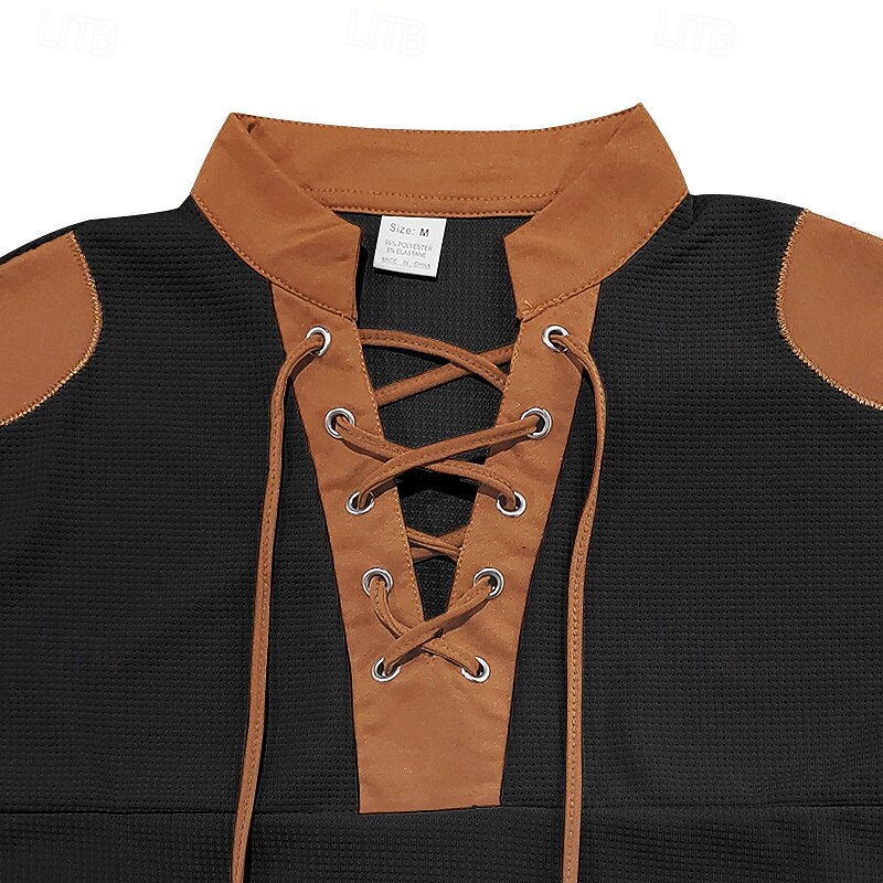 The shirt features a distinctive lace-up V-neck collar with brown accents, adding a rugged and fashionable twist. Brown details extend to the shoulder and elbow patches, enhancing the overall design with extra visual interest. Its versatile color block pattern, available in white, black, royal blue, apricot, and light grey, complements various wardrobe choices effortlessly.
