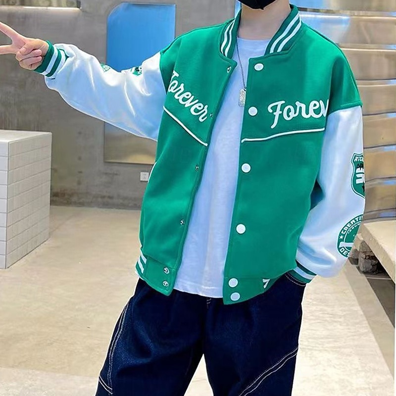 HOT ! Kids Unisex Baseball Jackets Outerwear Color Block Long Sleeve Comfort Buttons Soft Coat Outdoor Fashion Daily Black Green Spring Fall 4 years+