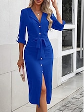 Highlights [Fabric] : Crafted from high-quality polyester, this dress offers a lightweight and breathable feel, ensuring comfort and ease throughout the day. Its micro-elasticity provides a relaxed yet flattering fit, perfect for various occasions. [Fit] : The dress features a relaxed, regular fit design that flatters all body types, while the midi length with a subtle front slit adds a touch of sophistication and allure. [Design Highlights] : Combining elegance and functionality, the dress is equipped with a classic lapel neckline and a button-down front for timeless appeal. The patchwork and belted design accentuates the waist, creating an elegant silhouette. Three-quarter length sleeves with adjustable roll-up options ensure versatility across seasons. [Occasions] : Suited for both casual and elegant settings, this dress transitions seamlessly from professional environments to street outings and social gatherings. Its timeless look and versatile design make it an essential addition to any wardrobe. [Size Range] : Available in sizes S, M, L, XL, and XXL, catering to a wide range of body types and ensuring a comfortable fit for everyone.