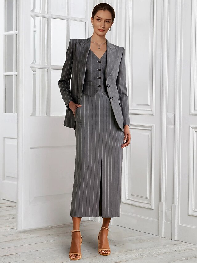 More information about 3 Pieces Tuxedo Dress Sets Sheath / Column Formal Wedding Guest Stretch Crepe Pinstripe Elegant Simple Long Sleeve Tea Length Peak Lapel Single Breasted