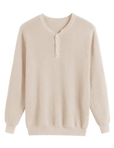 • 【Classic Fashion Design】The casual long sleeve pullover sweater for men with henley style, designed as 3-button placket, waffle textured, long sleeve, regular fit, ribbed knitted cuff & hem, solid color, crew henley neck.