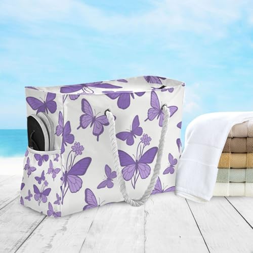 OTVEE Purple Butterflies Pattern Beach Bags for Women Ladies Large Canvas Tote Shoulder Bag Waterproof Travel Bags for Gym Swim Pool Camping 7