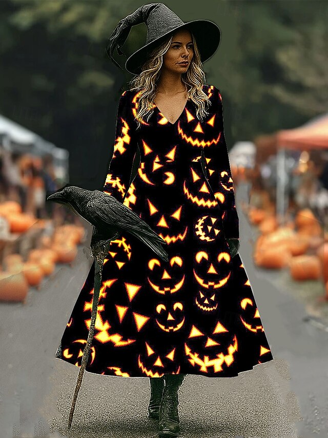 More information about Halloween Women's Witch Print Midi Dress Casual Dress A Line Dress Vacation Casual Wedding Party Birthday Regular Fit Graphic Long Sleeve V Neck Black Purple Orange Green Spring Fall