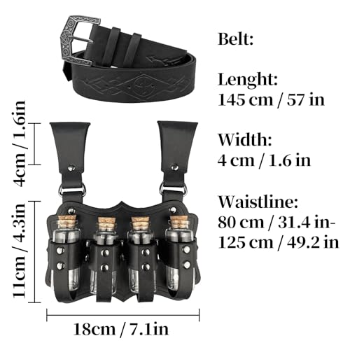 • SUPER COOL DESIGN: This black medieval belt combines practicality with a unique design. It comes equipped with four glass potion bottles, ideal for storing small amounts of liquids. Each bottle is securely fastened yet easily accessible. The leather belt is sure to stand out on Medieval cosplay events