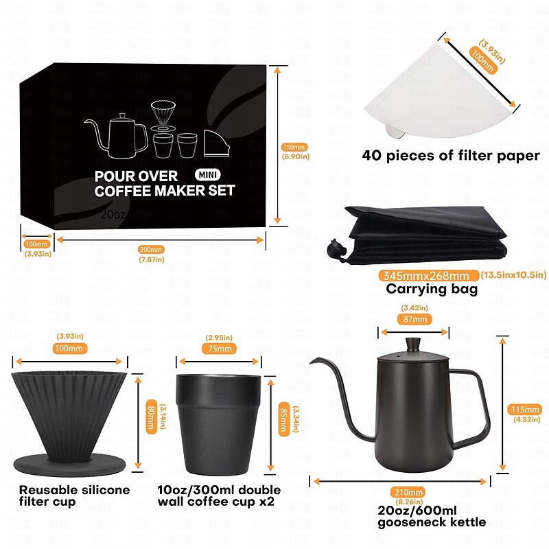 Highlights nd of kitchen décor. Its sleek and stylish appearance adds a touch of elegance to any countertop or coffee station. The minimalist design also ensures that it is easy to store and does not take up excessive counter space. Precise Temperature Control: Achieving the perfect cup of coffee requires the right combination of temperature and brewing time. Our coffee maker set features precise temperature control to ensure optimal extraction and a consistent, balanced flavor. You can rely on this set to deliver the perfect cup of coffee every time. Convenient and User-Friendly: We designed this coffee maker set to be convenient and easy to use. It features a user-friendly control panel with clear and intuitive buttons so that you can easily select your desired settings. The set also comes with a removable filter and water tank for effortless cleaning and maintenance.
