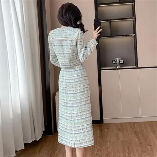 • Design: This two-piece knit suit consists of several design points Plaid tweed fabric, long sleeves, collarless, buttoned, side pockets, mini skirt, contrast trim, fully lined Round neck, long sleeves, button closure, elastic sweater jacket, raw edge hem, short skirt with elastic waistband, high waist. The unique design makes you look feminine and perfectly shows your body curves