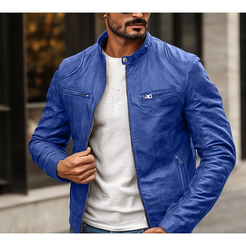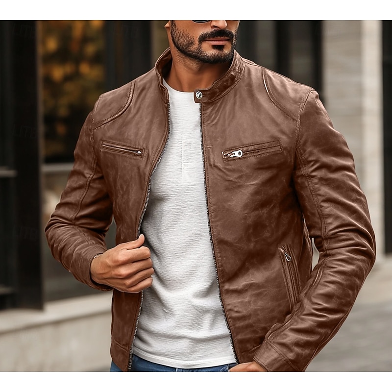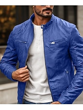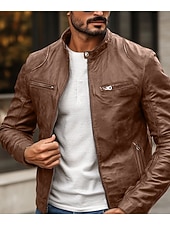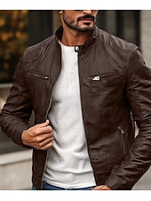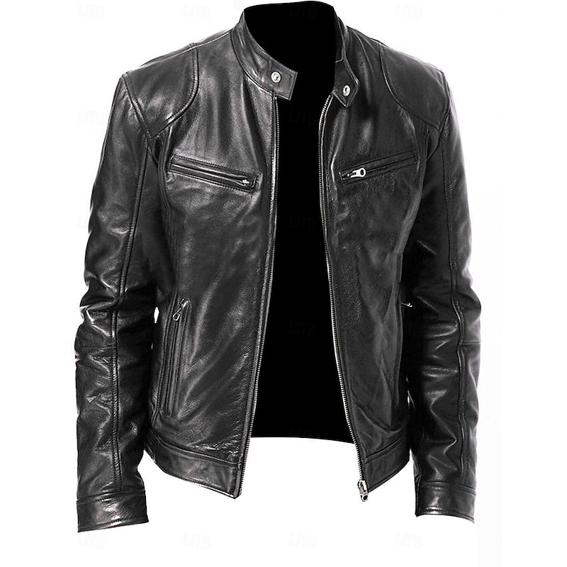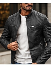 Highlights [Fabric] : This men's faux leather jacket is crafted from high-quality polyester and PU, providing a durable and sleek appearance. The fabric is not only rain waterproof but also offers thermal warmth, making it an excellent choice for fall and winter seasons. [Fit] : The jacket features a fitted silhouette that contours to the body, giving a stylish and contemporary fit. The regular outerwear length ensures comfort and versatility for everyday wear. [Design Highlights] : The jacket showcases a punk and vintage style with functional design elements such as a front zipper closure and zippered chest pockets. The stand collar with a snap-button detail adds a rugged yet refined touch, while the solid-colored pattern enhances its classic appeal. [Occasions] : Ideal for daily use, this jacket can be worn for various activities, whether you are going for a ride on your motorcycle or just need a fashionable layer for the colder months. Its versatile nature makes it suitable for both casual and semi-formal settings. [Size Range] : Available in a range of sizes from XS to XXL, ensuring a suitable fit for different body types and personal preferences.