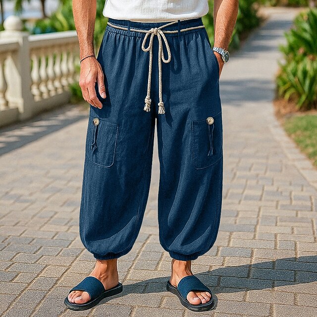 More information about Men's Linen Pants Trousers Summer Pants Baggy Pants Drawstring Elastic Waist Wide Leg Solid Color Plain Comfort Breathable Full Length Outdoor Yoga Casual Vacation Fashion Navy Blue Micro-elastic