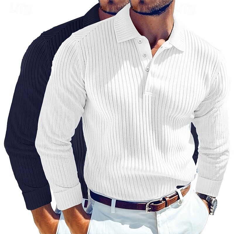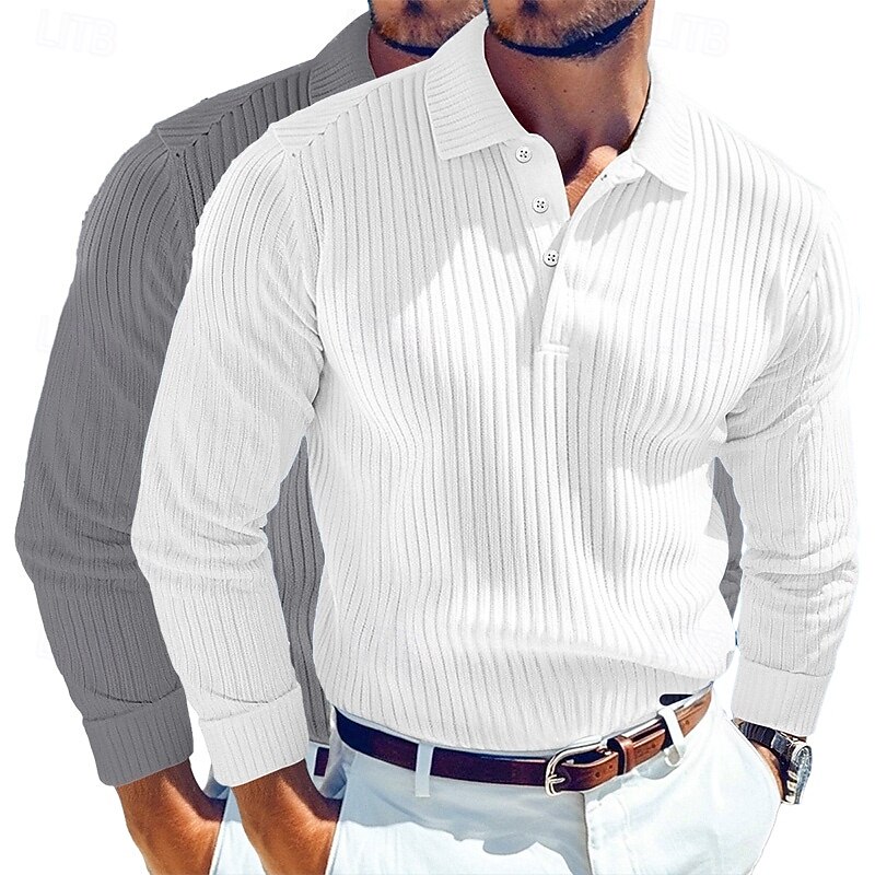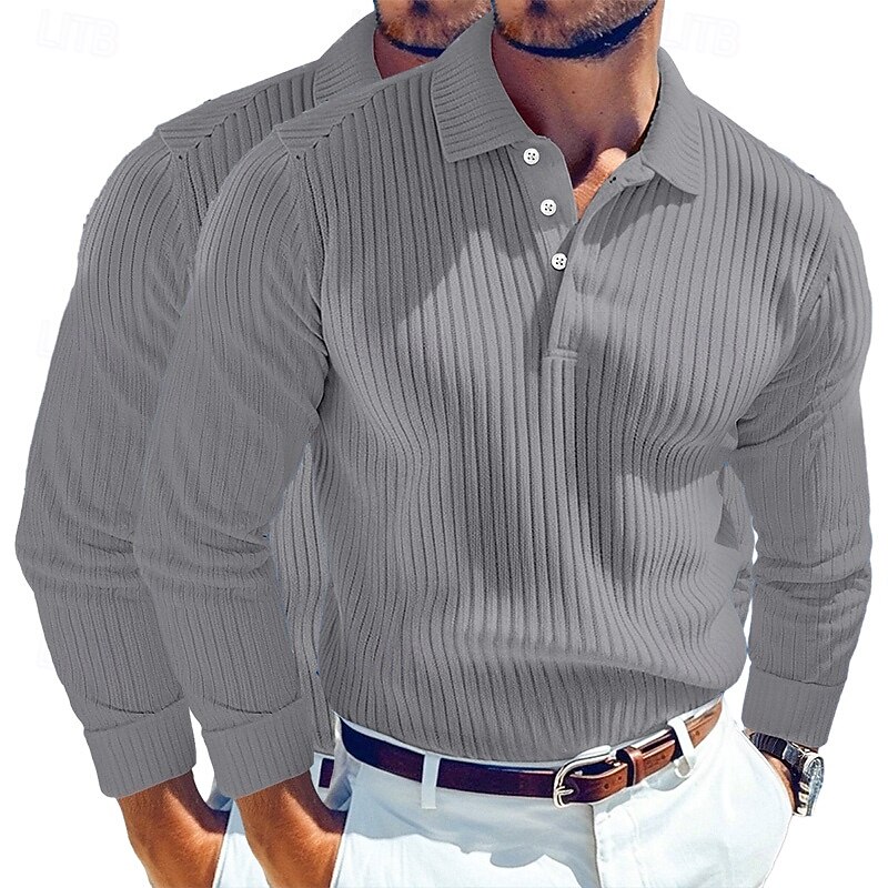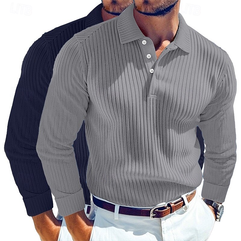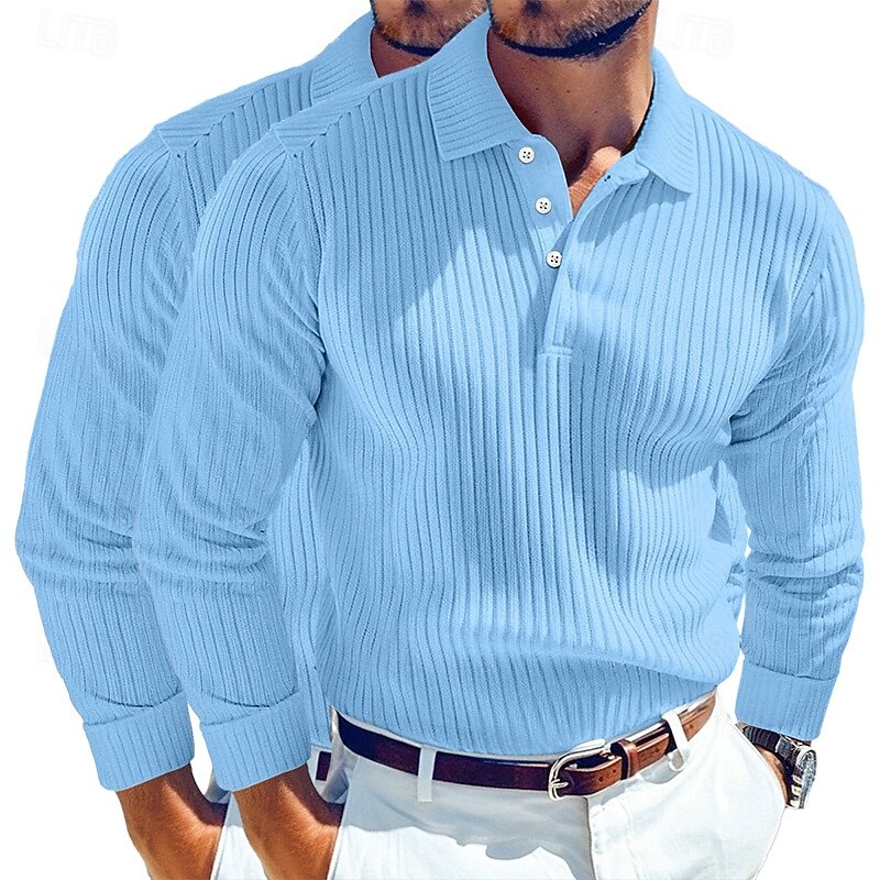 Men's Rib Knit Top Golf Shirt Street Casual Lapel Long Sleeve Basic Modern Plain 2 Piece Buttons Spring Fall All Seasons Regular Fit Gray / Navy Gray / White Blue + White Blue + Gray Blue + Navy 20