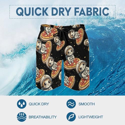 HOT ! Funny Cat Flying A Pizza Astronaut Men's Swim Trunks Quick Dry Board Shorts Hawaiian Beach Shorts With Pocket