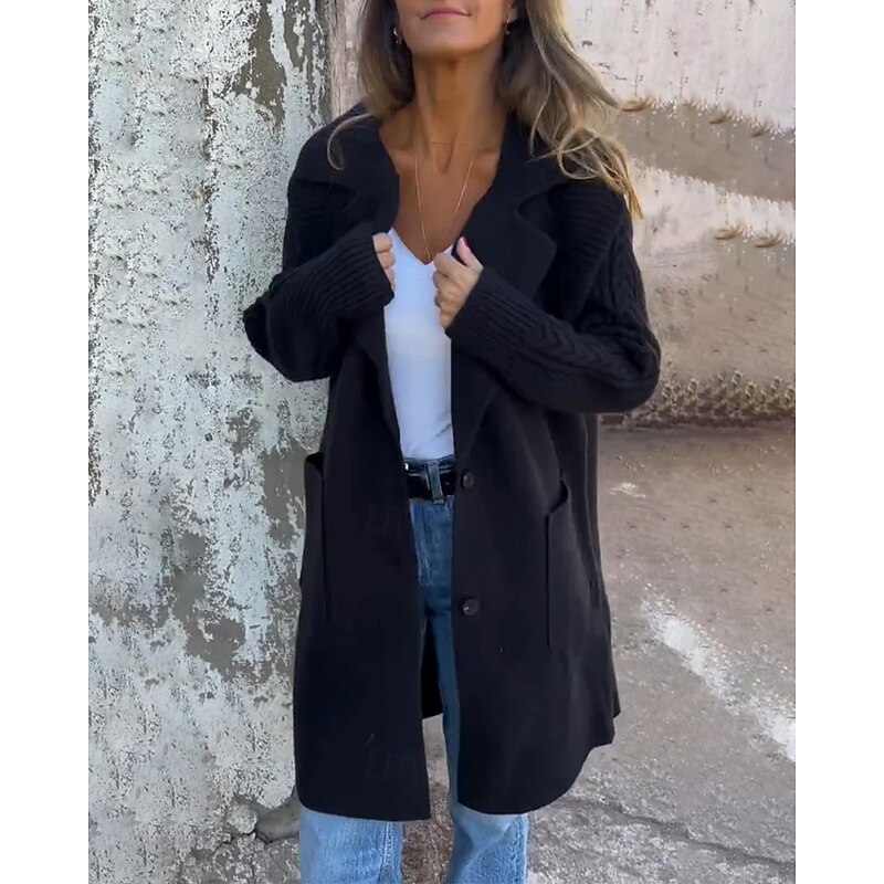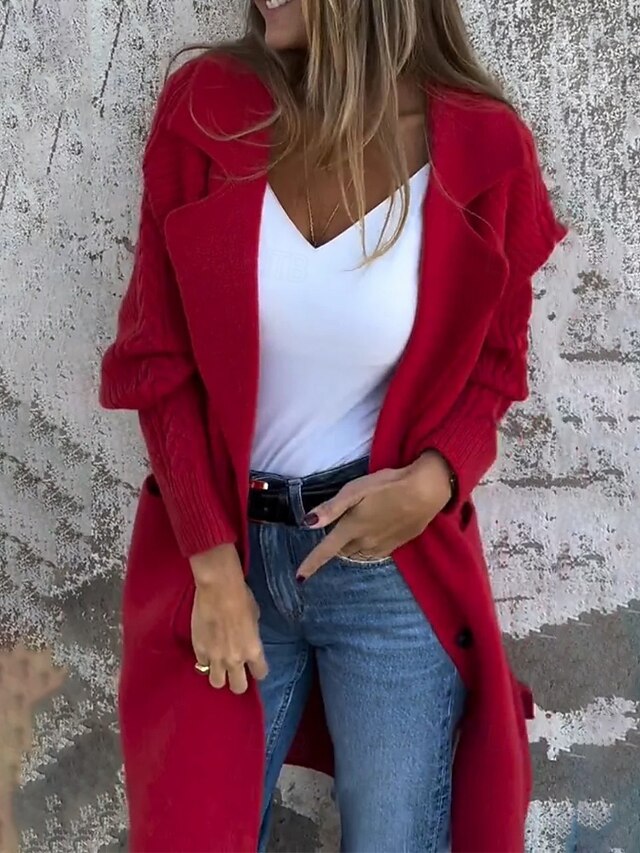 More information about Women's Cardigan Casual Soft Solid Color Cable Shirt Collar Pocket Knitted Long Sleeve Long Tops Knit Daily Going out Weekend Black Red Fall