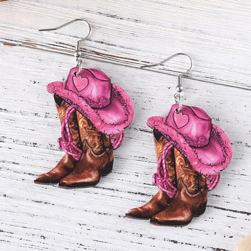 HOT ! Pink Cowboy Cowgirl Hat Boots Earrings for Women Double-sided Wood Dangle Western Earrings Jewelry Accessories for Cosplay Costume Halloween Party Decorations