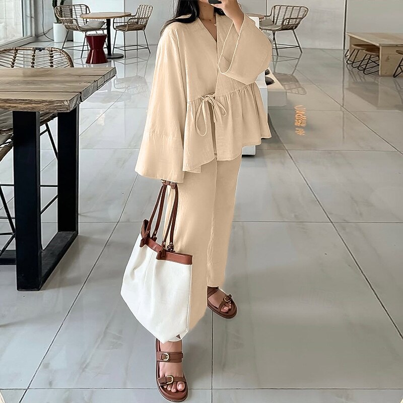 More information about Women's Elegant Bohemia Vacation Pants Sets Long Sleeve Bell Sleeve V Neck Solid Color Lace up Ruched Ruffle Outdoor Vacation Party off white Pink khaki Summer Loose Fit