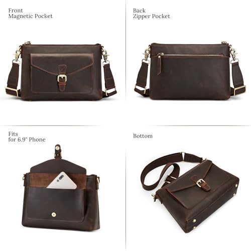 • [Top Grain Crazy Horse Leather] This trendy crossbody bag features a versatile style that complements any outfit. It is handcrafted of Crazy Horse Leather (genuine leather) and brass metal hardware, the natural disordered scratches on the leather surface show more retro and rustic. Each crossbody bag is unique and exquisite