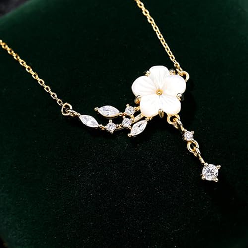 HOT ! Dainty 925 Sterling Silver White Shell Flower Pendant Necklaces for Women 14K Gold Plated Cute Birth Floral Artificial Lucky Leaf CZs Chain to Daugther Mom Elegant Wedding Choker Month Jewelry Gift