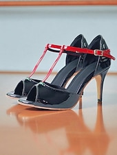 More information about Women's Black Patent Leather T-Strap Latin Dance Shoes with Red Buckle - Professional Ballroom Performance and Practice Heels