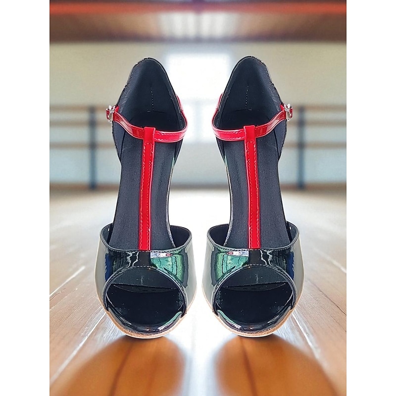 Women's Black Patent Leather T-Strap Latin Dance Shoes with Red Buckle - Professional Ballroom Performance and Practice Heels 1