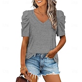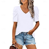 : This T-shirt features a regular fit with a flattering V-neckline designed to accentuate the neckline, complemented by puffed short sleeves that add a touch of elegance and volume. The micro-elasticity of the fabric allows for ease of movement, and the plain pattern makes it a versatile piece for any wardrobe.