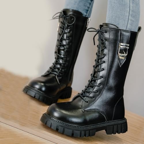 Girls Fashion Boots Lace up Side Zipper Ankle Booties Waterproof Fashion Western Boots Mid Calf Riding Shoes 4