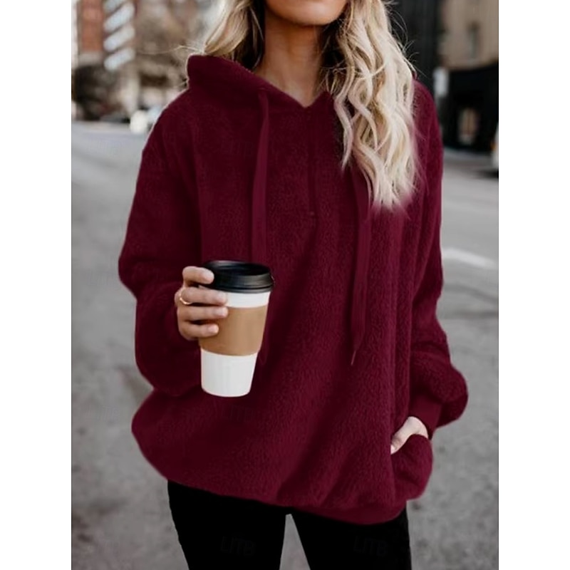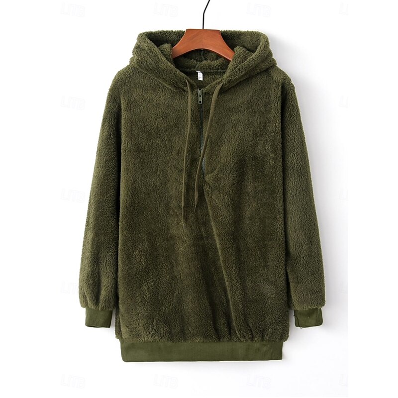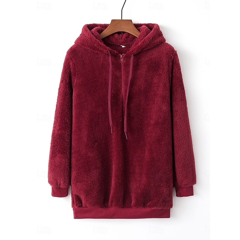 Highlights [Fabric] Crafted from a blend of polyester and sherpa, this women's hoodie offers a soft and plush texture, ensuring warmth and comfort during fall and winter. The material provides a cozy feel, making it perfect for chilly days. [Fit] Designed with a regular fit and long sleeves, the hoodie provides a casual and comfortable silhouette suitable for daily wear. Its micro-elasticity allows for easy movement and layering. [Design Highlights] Featuring a half-zip front, this hoodie includes modern design elements like a roomy front pocket and an adjustable drawstring hood, adding both style and functionality. The plain pattern and rich color options—brown, green, and wine—make it a versatile piece in any wardrobe. [Occasions] Ideal for streetwear and daily wear, this hoodie is perfect for both outdoor activities and lounging at home. It combines practicality with a stylish look, making it a go-to choice for various casual occasions. [Size Range] Available in sizes S, M, L, XL, and 2XL, this hoodie caters to a wide range of body types, providing a comfortable fit for everyone.