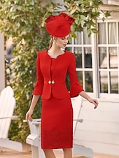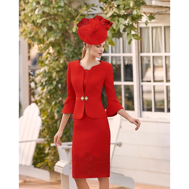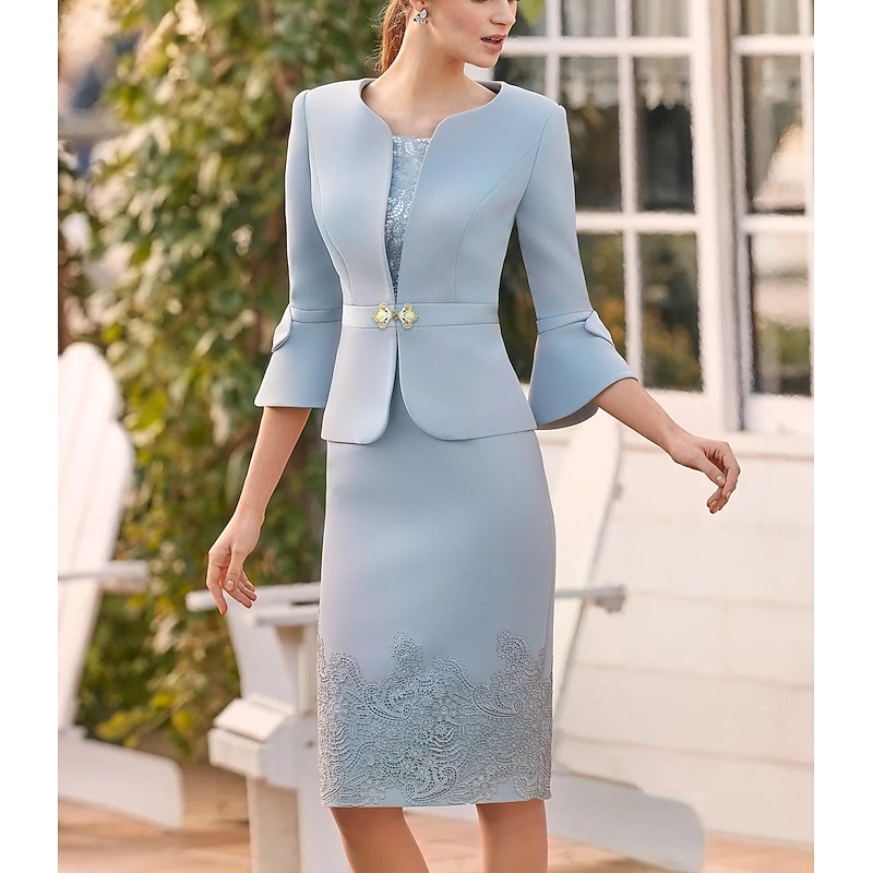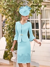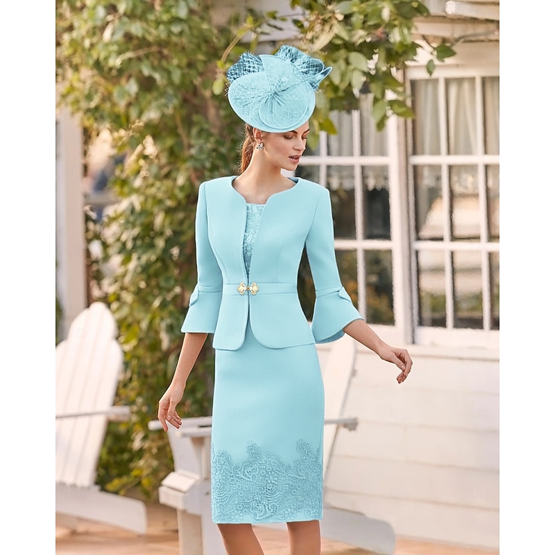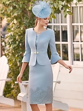 More information about Dress Sets Mother of the Bride Dress Formal Wedding Guest Elegant Vintage Jewel Neck Tea Length Stretch Fabric 3/4 Length Sleeve with Lace Pearls Race Day Dress